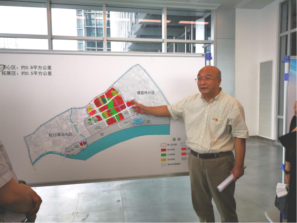第二站,全体党员来到北外滩来福士广场54层。北外滩风景一览无余,作为与陆家嘴、外滩构成的“黄金三角”中的一角,北外滩经外白渡桥与外滩相连,与陆家嘴金融相望,延绵起伏的建筑群尽收眼底,区位优势得天独厚。徐斌副所长为大家介绍了改革开放以来虹口区规划设计的变化,一张张区域规划图也见证了这里从港口码头到新时代都市发展新标杆的蜕变。
